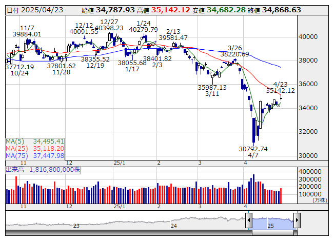 2025年04月24日07時57分 【市況】シカゴ日経平均先物 大取終値比 435円高 (4月23日) 日経平均 <日足> 「株探」多機能チャートよりシカゴ日経225先物 (円建て) 35355 ( +435 ) シカゴ日経225先物 (ドル建て) 35455 ( +535 ) ※( )は大阪取引所終値比 株探ニュース