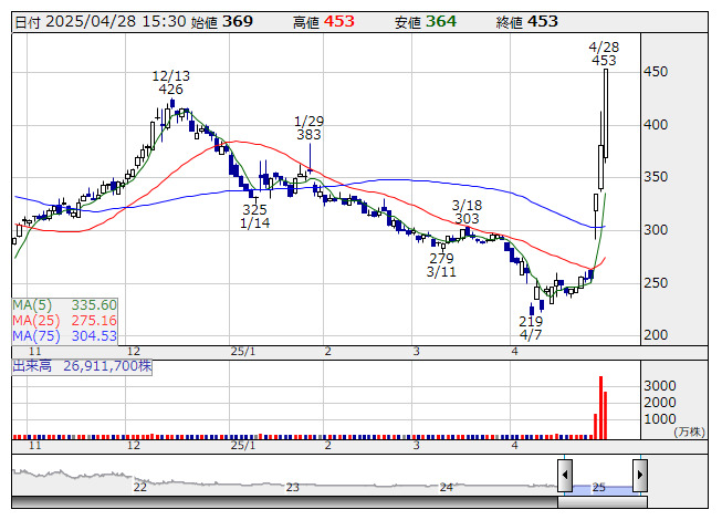 【材料】本日のランキング【寄付からの値上がり率】 (4月28日)