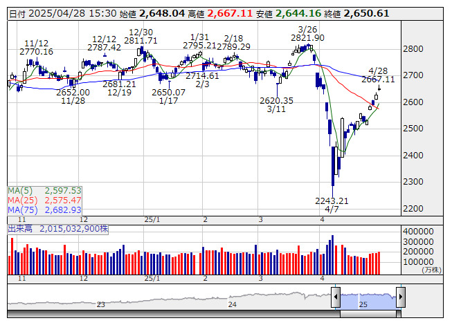 2025年04月28日15時47分 【市況】TOPIX先物:28日清算値=17.5ポイント高、2653.5ポイント TOPIX <日足> 「株探」多機能チャートより 28日15時45分、TOPIX先物期近2025年6月限は前週末清算値比17.5ポイント高の2653.5ポイントで取引を終えた。出来高は4万8869枚だった。この日のTOPIXの現物終値2650.61ポイントに対しては2.89ポイント高。 株探ニュース