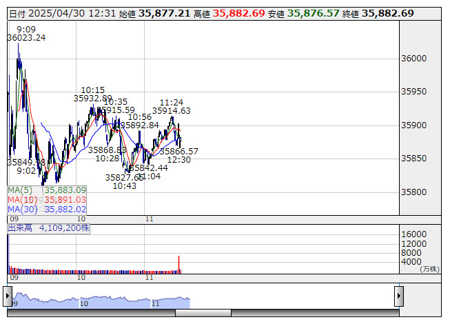 2025年04月30日12時31分 【市況】東京株式(後場寄り付き)=日経平均株価は前場終値比でやや伸び悩む 日経平均 <1分足> 「株探」多機能チャートより 後場寄り付き直後の東京株式市場では、日経平均株価が前営業日比40円高前後と前場終値と比較してやや伸び悩んでいる。外国為替市場では1ドル=142円40銭台の推移。アジアの主要株式市場は高安まちまち。 出所:MINKABU PRESS
