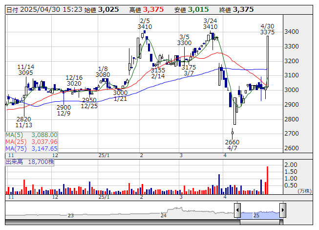 9687>が後場終盤に上げ幅を急拡大した。30日午後3時に25年3月期の連結決算を発表。あわせて26年3月期の業績・配当予想を開示した。今期の売上高は前期比7.6%増の254億円、最終利益は同5.9%増の19億7000万円を見込む。更に、前期の期末一括配当を従来の見通しから4円増額したうえで、今期の年間配当予想は前期比39円増配の163円とした。これらを好感した買いが入ったようだ。グループを取り巻くマーケット環境については、引き続き旺盛な需要状況が続くと想定する。25年3月期の売上高は前の期比8.4%増の236億800万円、最終利益は同9.3%増の18億6000万円だった。