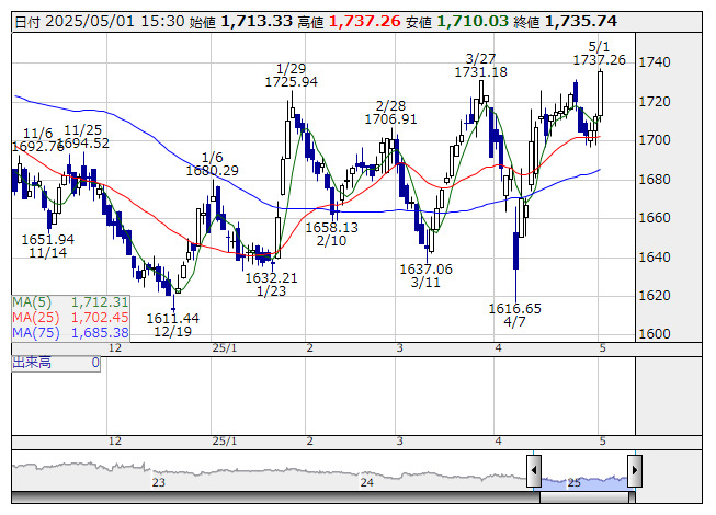 2025年05月01日15時48分 【市況】東証REIT指数先物:1日清算値=29.5ポイント高、1729.5ポイント REIT指数 <日足> 「株探」多機能チャートより 1日15時45分、東証REIT指数先物期近2025年6月限は前日清算値比29.5ポイント高の1729.5ポイントで取引を終えた。出来高は225枚だった。この日の東証REIT指数の現物終値1735.74ポイントに対しては6.24ポイント安。 株探ニュース