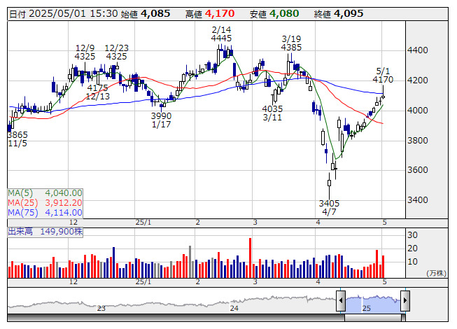 DTS <日足> 「株探」多機能チャートより※決算発表の集中期間(4月24日~5月15日)は、『決算特報』を毎日3本配信します。
