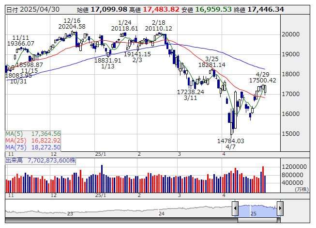 ソフトウエアメーカーのマイクロソフト(MSFT)やソーシャルテクノロジー会社のメタ・プラットフォームズ(META)など主要ハイテク企業の好決算を好感した買いに、寄り付き後、上昇。その後も、対中貿易協議の可能性を期待した買いや、ウクライナとの資源協定提携が成長減速や地政学的リスク懸念を和らげ買い戻しが先行し、相場は終日堅調に推移し終了した。セクター別ではソフトウエア・サービスやメディア・娯楽が上昇した一方、不動産管理・開発が下落。