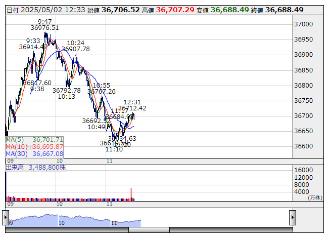 2025年05月02日12時33分 【市況】東京株式(後場寄り付き)=日経平均株価は前場終値比で横ばい圏 日経平均 <1分足> 「株探」多機能チャートより 後場寄り付きの東京株式市場では、日経平均株価が前日比250円高前後と前場終値から横ばい圏で推移している。外国為替市場では、1ドル=145円30銭近辺での値動きとなっている。 出所:MINKABU PRESS