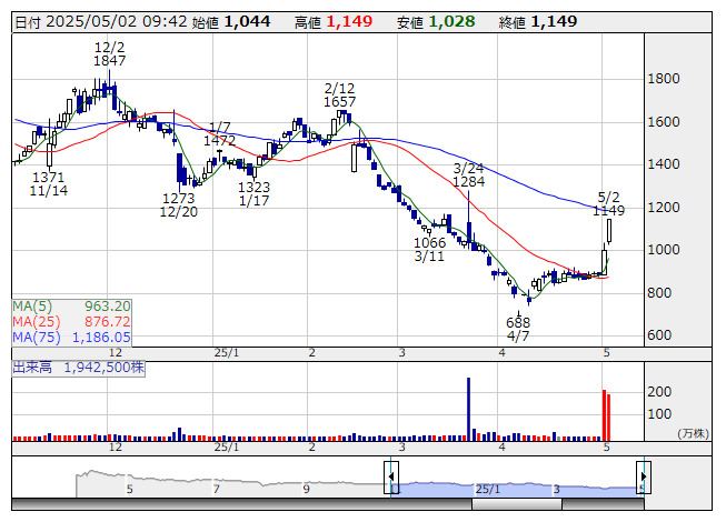 153A>がストップ高カイ気配に張り付く人気となっている。前日ザラ場にストップ高に買われ、その後伸び悩んだとはいえ、大引け段階で110円高の999円で着地した。投資資金の流入はきょうも続き、朝高後にいったん目先筋の利益確定売りをこなす時間帯はあったものの、その後は再加速し値幅制限上限まで一気に駆け上がった。法人向けにクラウド型不正アクセス検知サービスを手掛けており、ここ証券口座乗っ取り被害が大きな関心を集めるなか、その対策関連の急先鋒として頭角を現している。昨年3月下旬にグロース市場に上場したニューフェースだが、今月7日に上場後の最安値688円をつけた後だけに、大底からのリバウンド初動と見た投資資金の流入を誘っている。