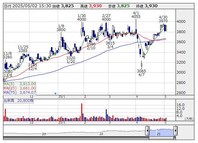 日本電技 <日足> 「株探」多機能チャートより◇5月5日