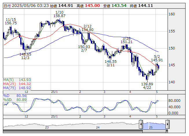 米ドル/円 <日足> Slowストキャス 「株探」多機能チャートより米財務省は580億ドル規模の3年債入札を実施した。結果で最高落札利回りは3.824%と、テイルはマイナス0.2ベーシスポイント(bps)。過去6か月入札平均はプラス0.7bpsだった。応札倍率は2.56倍と、過去6回入札平均の2.63倍を下回り需要は弱かった。一方、外国中銀や大手機関投資家を含む間接入札者の比率は62.4%。過去6回入札平均の67.6%を下回り、外国資本の米資産投資は依然控えめ。
