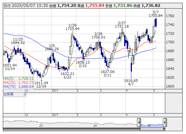 2025年05月07日15時48分 【市況】東証REIT指数先物:7日清算値=11ポイント安、1734ポイント REIT指数 <日足> 「株探」多機能チャートより 7日15時45分、東証REIT指数先物期近2025年6月限は前週末清算値比11ポイント安の1734ポイントで取引を終えた。出来高は204枚だった。この日の東証REIT指数の現物終値1736.82ポイントに対しては2.82ポイント安。 株探ニュース