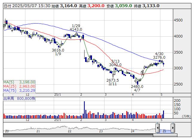 JMDC <日足> 「株探」多機能チャートより※決算発表の集中期間(4月24日~5月15日)は、『決算特報』を毎日3本配信します。
