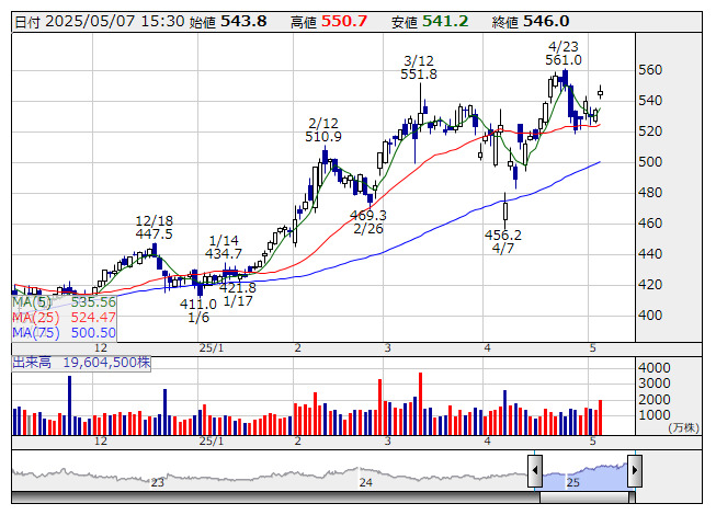 ラインヤフー <日足> 「株探」多機能チャートより25年3月期はメディア事業において利益率の高いアカウント広告が拡大したほか、PayPayの成長も寄与した。26年3月期は売上高が前期比9.5%増の2兆1000億円を計画。調整後EBITDA(利払い・税引き・償却前利益)は同6.2%~8.3%増の5000億~5100億円を見込む。
