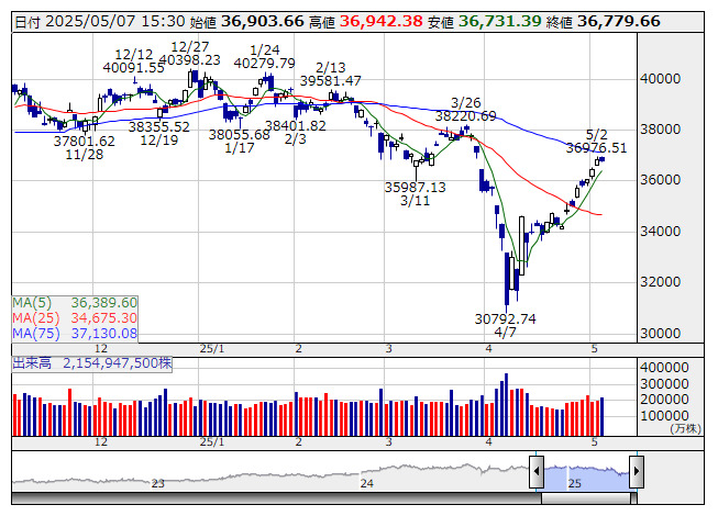 日経平均 <日足> 「株探」多機能チャートより日本取引所が公表した先物手口情報によると、5月7日の日経225ミニ期近(2025年5月限)の夜間取引(立会内・J-NETの合算)で、取引高トップはABNクリアリン証券の1万2835枚だった。