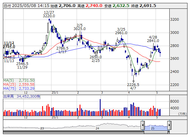 2025年05月08日14時14分 【材料】トヨタは後場下げに転じる、26年3月期連結純利益の3割減益予想を嫌気 トヨタ <日足> 「株探」多機能チャートより トヨタ自動車<7203>が後場、下げに転じる。同社は午後1時55分に決算発表を行い、26年3月期の連結純利益予想を前期比34.9%減の3兆1000億円との見通しを示した。市場では純利益は約4兆1000億円前後を予想する見方が出ていた。今期配当は前期比5円増の95円の見込み。今期の想定為替レートは1ドル=145円前後とされている。 25年3月期連結純利益は前の期比3.6%減の4兆7650億8600万円となった。 出所:MINKABU PRESS