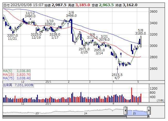 2025年05月08日15時07分 【材料】富士フイルムは後場切り返す、今期の業績見通しを評価 富士フイルム <日足> 「株探」多機能チャートより 富士フイルムホールディングス<4901>は後場に入りマイナス圏から切り返している。この日午後2時ごろ、26年3月期連結業績予想について売上高を前期比2.6%増の3兆2800億円、営業利益を同0.3%増の3310億円と発表。配当については前期分を60円から65円に増額した上で、今期は更に上乗せして70円とする見込み。堅調な業績見通しを評価した買いが入っている。 米国の関税政策による影響は織り込んでいないとしつつも、リスクとして共通関税10%と、米中間での相互関税引き上げによる影響を想定しているという。なお、同時に発表した25年3月期決算は売上高が前の期比7.9%増の3兆1958億円、営業利益は同19.3%増の3301億5500万円だった。 出所:MINKABU PRESS