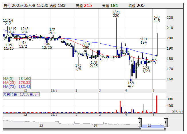 1. <7524> マルシェ 205 (+13.9%) 1,038 ( 220倍)