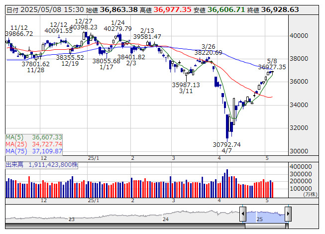 日経平均 <日足> 「株探」多機能チャートより日本取引所が公表した先物手口情報によると、5月8日の日経225ミニ期近(2025年5月限)の日中取引(立会内・J-NETの合算)で、取引高トップはABNクリアリン証券の1万4431枚だった。
