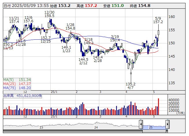 9432>が後場に上げ幅を拡大。上昇率は一時5%を超え、東証全銘柄で出来高トップ。大商いとなっている。9日午後1時、取得総数15億株(自己株式を除く発行済み株式総数の1.81%)、取得総額2000億円を上限とする自社株買いの実施を発表。更に、26年3月期の業績予想を公表し、売上高は前期比3.5%増の14兆1900億円、最終利益は同4.0%増の1兆400億円となる見通しを示した。年間配当は同10銭増配の5円30銭を計画している。増益予想と株主還元姿勢を好感した買いが集まったようだ。NTTデータグループ<