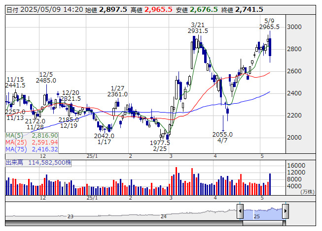 7011>が後場に急落した。9日午後1時30分、25年3月期の連結決算発表にあわせ、26年3月期の業績予想を開示。今期の売上高は前期比7.4%増の5兆4000億円、最終利益は同5.9%増の2600億円となる見通しを示した。受注高は同16.6%減の5兆9000億円を計画する。受注高の減少見通しに加え、今期の利益計画の水準に対しても物足りなさが意識され、売り圧力が高まったようだ。業績予想に関しトランプ関税の影響については、アップサイド・ダウンサイドの両面で含んでいないとした。今期の受注高は航空・防衛・宇宙部門で前期比7001億円減の1兆4000億円、エナジー部門で同4224億円減の2兆2000億円を予想している。想定為替レートは1ドル=145円、1ユーロ=155円。今期の年間配当予想は同1円増配の24円としている。