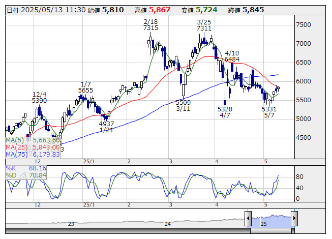 <8136> サンリオ 5845 +95 ( +1.7%) 5843.0