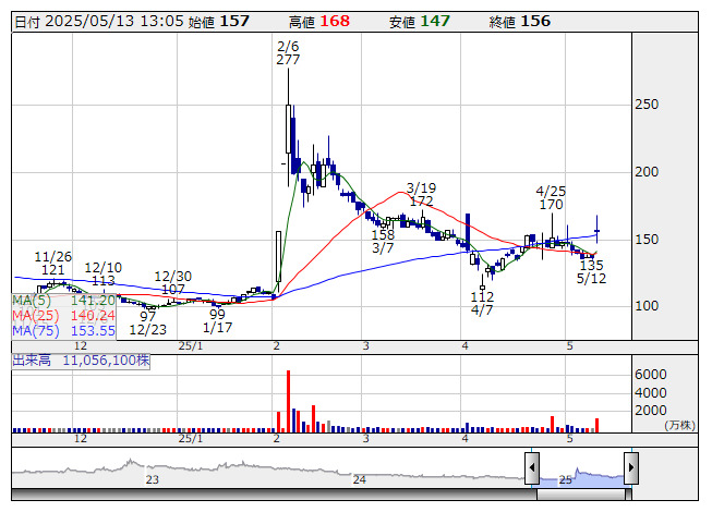 急騰。12日の取引終了後に、25年3月期通期業績予想の上方修正を発表し、好材料視されている。売上高は26.61億円から29.78億円(12%増)に、経常損益は1.74億円の赤字から0.62億円の黒字に転換する見通しとした。売上高の修正は、研究支援事業で100%子会社であるREPROCELL USA Inc.における研究試薬等の販売事業や、REPROCELL Europe Ltd.におけるヒト組織アッセイの販売事業の売上が想定より好調に推移したことなどが要因としている。