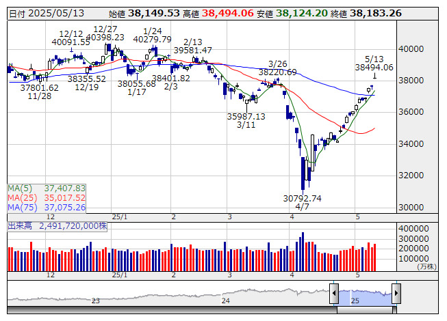 14日の東京株式市場は強弱観対立のなかも根強い買いが続き、日経平均株価は5日続伸となりそうだ。前日は欧州株市場が高安まちまちながら、ドイツの主要株価指数であるDAXは4日続伸し史上最高値更新を続けた。仏CAC40も小幅ながら4日続伸と上値指向が続いている。米国と他国との間で進められる協議が進展することへの期待が引き続きリスク選好の地合いにつながっている。ただ、上値は重く様子見ムードも漂う。米国ではハイテク株中心に買いが続いたが、米ヘルスケア大手のユナイテッドヘルス<