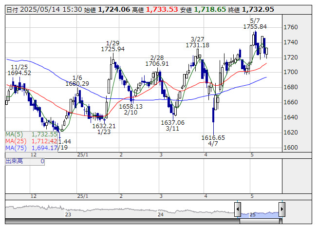 2025年05月14日15時48分 【市況】東証REIT指数先物:14日清算値=4.5ポイント高、1727ポイント REIT指数 <日足> 「株探」多機能チャートより 14日15時45分、東証REIT指数先物期近2025年6月限は前日清算値比4.5ポイント高の1727ポイントで取引を終えた。出来高は186枚だった。この日の東証REIT指数の現物終値1732.95ポイントに対しては5.95ポイント安。 株探ニュース
