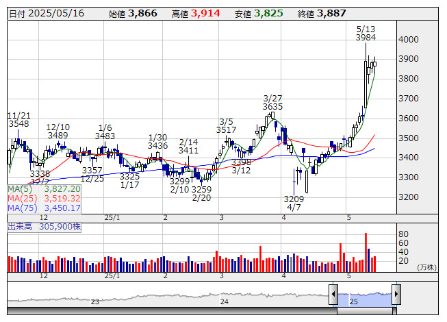 上組 <日足> 「株探」多機能チャートより(東証プライム上場 1629 銘柄対象)