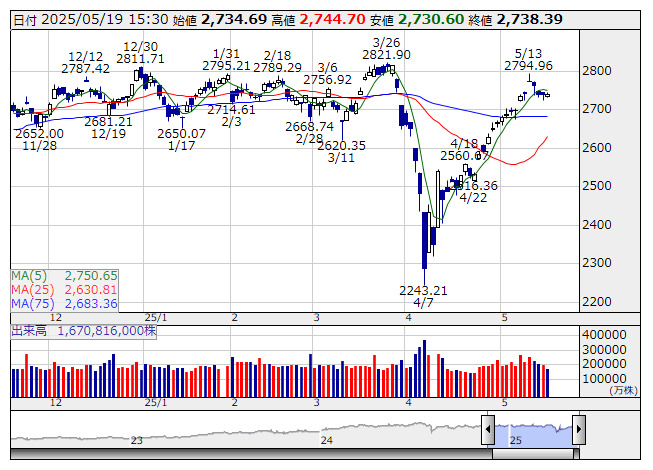 2025年05月19日15時47分 【市況】TOPIX先物:19日清算値=11ポイント安、2732.5ポイント TOPIX <日足> 「株探」多機能チャートより 19日15時45分、TOPIX先物期近2025年6月限は前週末清算値比11ポイント安の2732.5ポイントで取引を終えた。出来高は3万1367枚だった。この日のTOPIXの現物終値2738.39ポイントに対しては5.89ポイント安。 株探ニュース