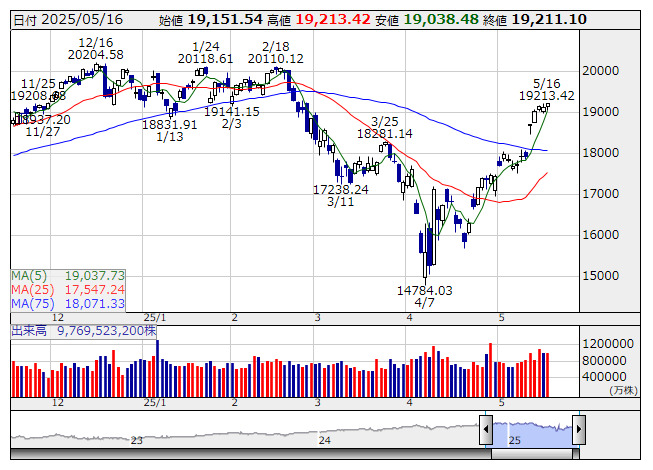 NASDAQ <日足> 「株探」多機能チャートより米国株式市場は続伸。ダウ平均は137.33ドル高の42792.07ドル、ナスダックは4.36ポイント高の19215.46で取引を終了した。