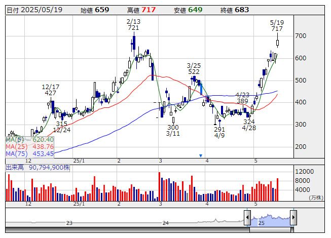メタプラ <日足> 「株探」多機能チャートより(東証上場 4260 銘柄対象[ETF、REIT含む])