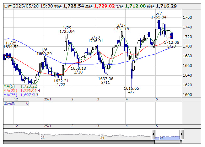 2025年05月20日15時48分 【市況】東証REIT指数先物:20日清算値=14ポイント安、1714ポイント REIT指数 <日足> 「株探」多機能チャートより 20日15時45分、東証REIT指数先物期近2025年6月限は前日清算値比14ポイント安の1714ポイントで取引を終えた。出来高は850枚だった。この日の東証REIT指数の現物終値1716.29ポイントに対しては2.29ポイント安。 株探ニュース