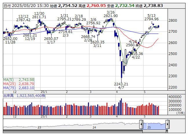 TOPIX <日足> 「株探」多機能チャートより日本取引所が公表した先物手口情報によると、5月20日のTOPIX先物期近(2025年6月限)の夜間取引(立会内・J-NETの合算)で、取引高トップはABNクリアリン証券の9832枚だった。