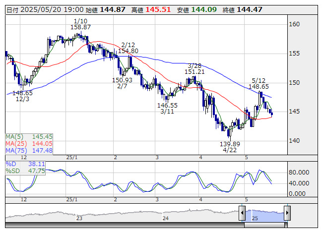 2025年05月20日19時01分 【通貨】外為:1ドル144円48銭前後とドル高・円安で推移 米ドル/円 <日足> Slowストキャス 「株探」多機能チャートより 20日の外国為替市場のドル円相場は午後7時時点で1ドル=144円48銭前後と、午後5時時点に比べ36銭のドル高・円安。ユーロ円は1ユーロ=162円61銭前後と10銭のユーロ高・円安で推移している。 株探ニュース
