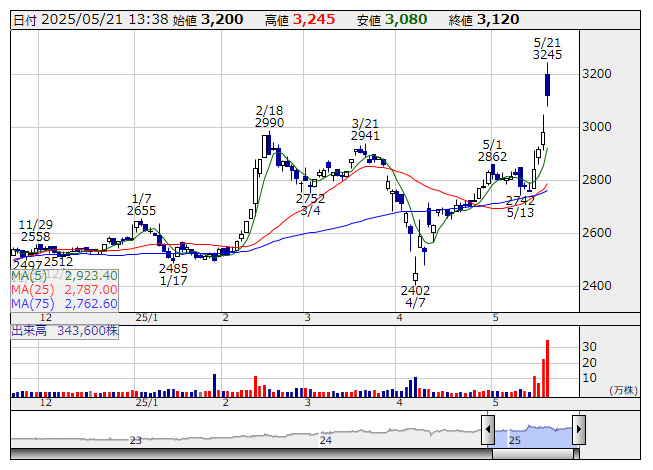 1847>は大幅続伸。マルハンが資本関係の強化を目的としてTOBを実施すると発表している。TOB価格は3500円で前日終値比17.4%のプレミアムとなる。買い付け予定数の上限は56万800株としており、保有比率を現在の32.27%から40%に引き上げる計画。一定のプレミアム期待に加えて、関係強化による業績へのシナジーを期待する動きも優勢。同時に発表した決算では、25年3月期営業利益は従来計画上振れ着地も26年3月期は減益見通しに。