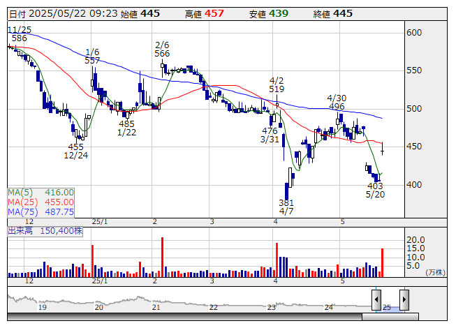 2025年05月22日09時23分 【材料】エーアイは高い、自社株買いを好感 エーアイ <日足> 「株探」多機能チャートより エーアイ<4388>は高い。21日取引終了後、取得上限35万株(自己株式を除く発行済み株数の5.39%)、または2億5000万円とする自社株買いの実施を発表した。期間は5月22日~来年2月28日。これを好感した買いが入っている。 これに伴い、2月6日から実施中だった自社株買い(取得上限35万株・2億5000万円)を中止するとあわせて明らかにした。5月20日までに33万4500株を取得したという。 出所:MINKABU PRESS