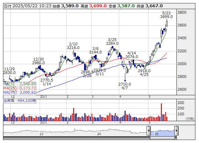 共立メンテ <日足> 「株探」多機能チャートより■財務省 : 5月22日受付