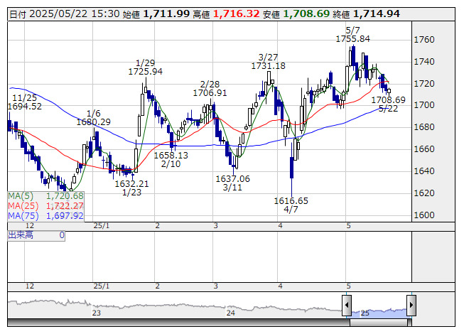 2025年05月22日15時48分 【市況】東証REIT指数先物:22日清算値=4ポイント高、1713ポイント REIT指数 <日足> 「株探」多機能チャートより 22日15時45分、東証REIT指数先物期近2025年6月限は前日清算値比4ポイント高の1713ポイントで取引を終えた。出来高は148枚だった。この日の東証REIT指数の現物終値1714.94ポイントに対しては1.94ポイント安。 株探ニュース