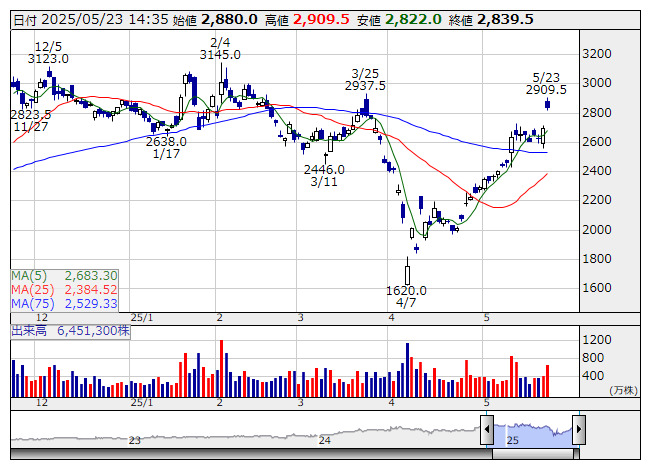 2025年05月23日14時34分 【材料】住友電工---大幅続伸、説明会を受けて見直しの動き強まる形に 住友電 <日足> 「株探」多機能チャートより 住友電工<5802>は大幅続伸。前日に会社説明会を開催しており、見直しの動きへとつながっているもよう。光デバイスや光配線材など情報通信事業に関してポジティブな見方が多かったもよう。また、マルチコアファイバーは、これまでの海底ケーブル主体からDC 内でも採用の可能性が高まっているとしているようだ。ハーネスに関しても関税の影響は懸念されるが、足元まで受注シェアは上昇傾向にあるもよう。 《ST》 提供:フィスコ