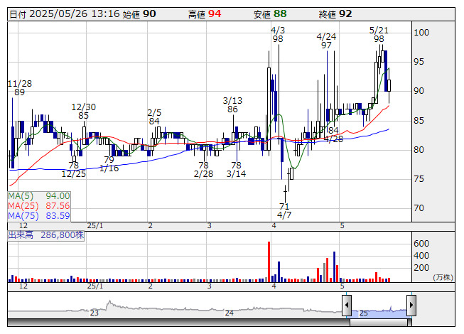 2025年05月26日13時25分 【材料】エイシアンSが反発、連結子会社が販売用不動産を売却 エイシアンS <日足> 「株探」多機能チャートより ASIAN STAR<8946>が反発している。この日、連結子会社が保有する販売用不動産を売却すると発表しており、好材料視されている。売却先及び取引内容の詳細は非開示としているが、売却額は24年12月期連結売上高(33億5100万円)の10%に相当する額以上という。なお、同件が25年12月期業績に与える影響は、業績予想に織り込み済みとしている。 出所:MINKABU PRESS