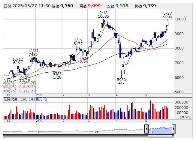 7013>と並ぶ防衛関連株の主力に位置付けられており注目度が高い。防衛関連はトランプ関税などの影響を受けにくいグローバルなテーマとして注目されており、前日の欧州株市場でもドイツの防衛関連大手として注目されるラインメタルが3%高に買われ、全体相場を牽引した。米国では防衛向けビッグデータ解析のパランティアテクノロジーズ<
