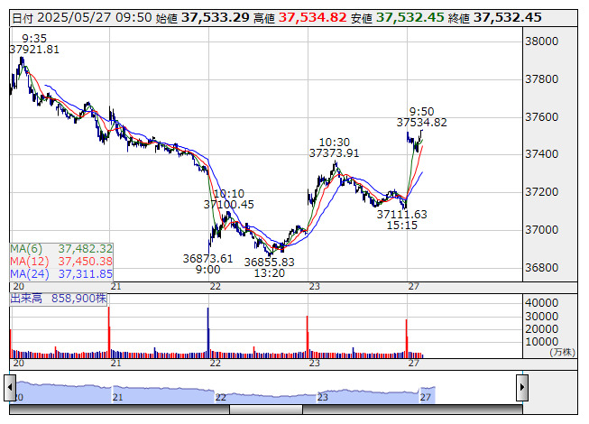 2025年05月27日09時51分 【市況】日経平均がプラス転換 日経平均 <5分足> 「株探」多機能チャートより 日経平均株価がプラス転換。9時50分現在、3.29円高の3万7534.82円まで上昇している。 株探ニュース