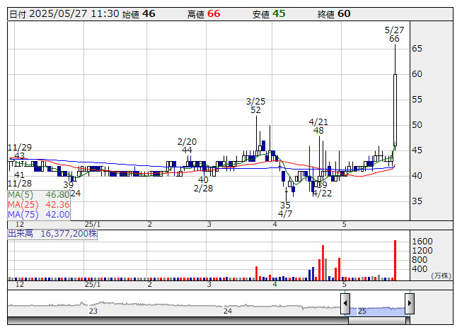 【材料】前場のランキング【寄付からの値上がり率】 (5月27日)