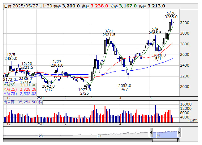 内需株優位との見方もあるが、国内も景気先行きに不透明感が強くインバウンド関連も含めてテーマ買いの動きが鈍くなっているのが現状だ。そうしたなか、防衛関連はトランプ関税などの影響を受けにくいグローバルなテーマとして注目度が再び高まっている。防衛省との取引額で群を抜く三菱重工業<7011>は5月中旬を境に上値指向を強め、直近8営業日で7日上昇し、きょうも目先筋の売りをこなし頑強な値動き。週明けに上場来高値を更新した。IHI<7013>も急勾配の上昇トレンドを形成し、前週末23日に2000年以降の最高値をつけている。三羽烏の中でやや遅れている川崎重工業<7012>もここ機関投資家とみられる大口の買いが観測され、目を見張る売買代金で高値更新を目前に捉えている。