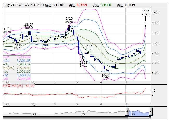 ジーエヌアイ <日足> ボリンジャー/カイリ率 「株探」多機能チャートより●株価が+3σを上回った銘柄(市場人気順) ★株価の上げ足が速過ぎ、売りが出やすい銘柄