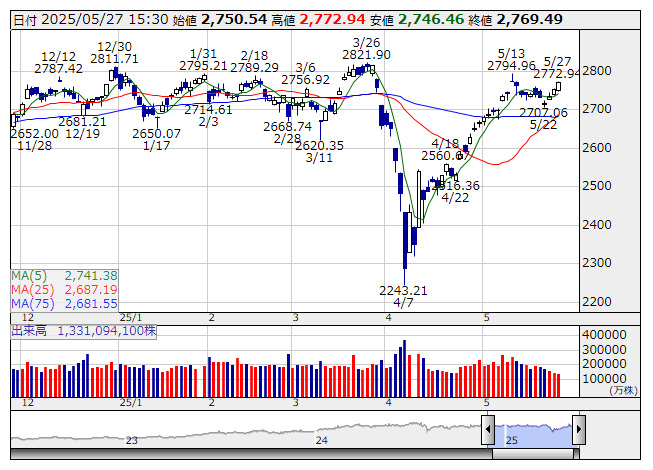 2025年05月27日15時47分 【市況】TOPIX先物:27日清算値=21.5ポイント高、2777.5ポイント TOPIX <日足> 「株探」多機能チャートより 27日15時45分、TOPIX先物期近2025年6月限は前日清算値比21.5ポイント高の2777.5ポイントで取引を終えた。出来高は2万6652枚だった。この日のTOPIXの現物終値2769.49ポイントに対しては8.01ポイント高。 株探ニュース