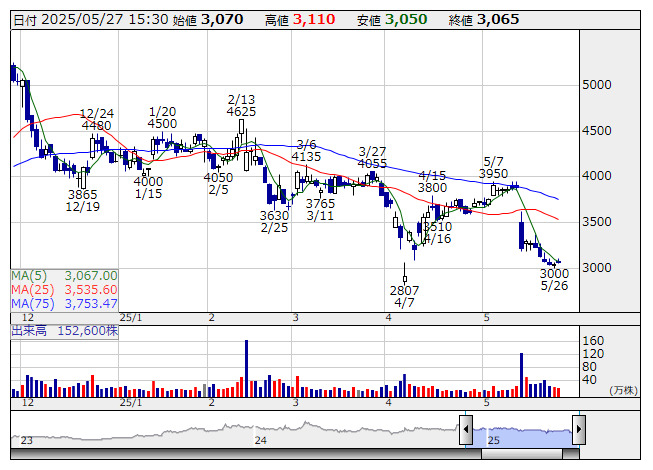 急騰。26日の取引終了後に、取得し得る株式の総数28万株(自己株式を除く発行済株式総数の6.17%)、または取得価額の総額2億円を上限として、自社株買いを実施すると発表し、これを好感した買いが優勢となっている。取得期間は25年5月27日~26年2月27日。自社株買いを実施する理由は、経営環境の変化に対応した機動的な資本政策の遂行および株主への利益還元のためとしている。