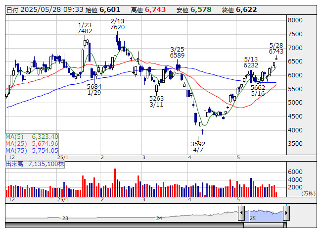5803>が4連騰と戻り足を強めている。AIデータセンターへの投資がややオーバーヒートしているという見方からデータセンター向け光ファイバーや光関連部品を手掛ける同社も3月下旬から4月上旬にかけて大きく水準を切り下げたが、ここに来ての戻り足が鮮明だ。アラブ首長国連邦(UAE)が、米国のスターゲート計画に出資を行い両国のAIインフラ構築で協業体制を取る構えで、UAEにデータセンターを建設し来年までに稼働を目指す方針にあるなど、直近ではAI投資に向けた外部環境が再び変化している。そうしたなか、同社株は20日付で大手証券が目標株価を引き下げ、いったん売りを誘ったのも束の間、その後は倍返しの急速リバウンドに転じている。4月急落前の3月25日につけた戻り高値6589円を払拭し戻り新値を形成しており、足もとでショート筋の踏み上げを誘っている。