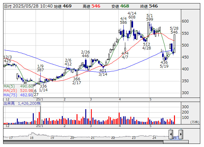 【材料】前場のランキング【寄付からの値上がり率】 (5月28日)