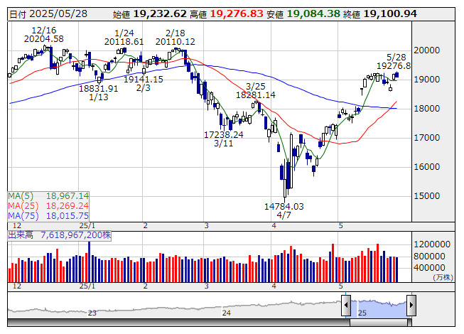 本日は伸び悩みか。トランプ政権の高関税政策に対する差し止めを受け、世界経済の減速に対する懸念の後退で買い優勢の見通し。ただ、トランプ政権は直ちに控訴し、議論の行方を見極めようと買一巡後は動きづらい。一方、エヌビディアの業績は市場の期待を上回り時間外取引で買われたが、次期業績縮小の見通しが材料視されればハイテク買いは限定的に。一方、前日の百貨店大手メーシーズに続き、家電量販店ベストバイが堅調なら消費や景気敏感などへの買いが入りやすい。