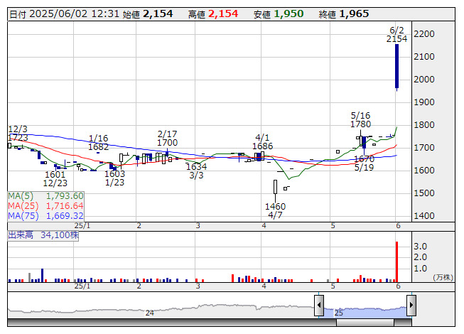 5530>が続急伸し上場来高値を更新している。5月30日の取引終了後、25年6月末時点の株主から株主優待制度を導入すると発表したことが好感されている。毎年6月末時点で1単元(100株)以上を保有する株主を対象に、保有株数に応じてQUOカードを1000円~4000円分贈呈する。なお、初回の25年6月末時点の株主には、保有株数100株以上200株未満の株主に対してはQUOカード2000円分、保有株数200株以上の株主に対してはQUOカード4000円分を贈呈する。